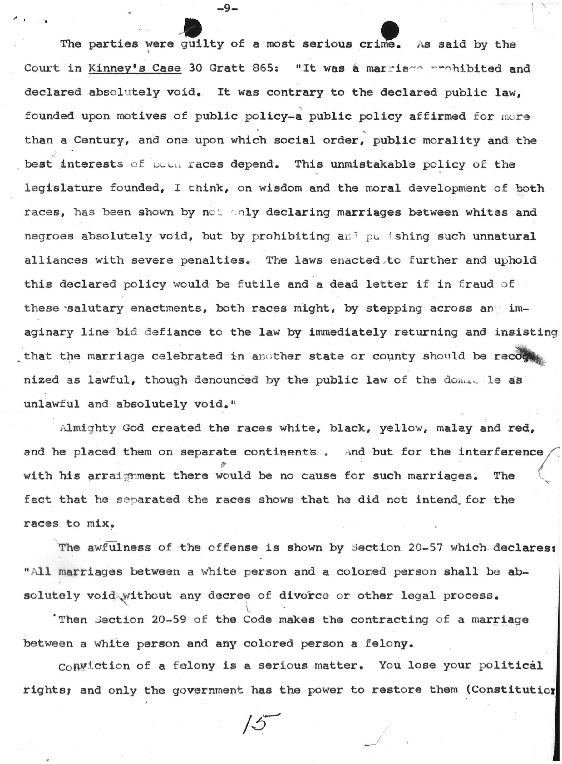 Citation: Excerpt from Leon Bazile’s decision, Jan. 22, 1965, in Commonwealth v. Richard Perry Loving and Mildred Delores Jeter, 1958-1966, Caroline Co. Court Records (reel 79), Local Government Records Collection, Library of Virginia and excerpt from "The Crime of Being Married" (with photographs by Grey Villet), Life Magazine, March 18, 1966.