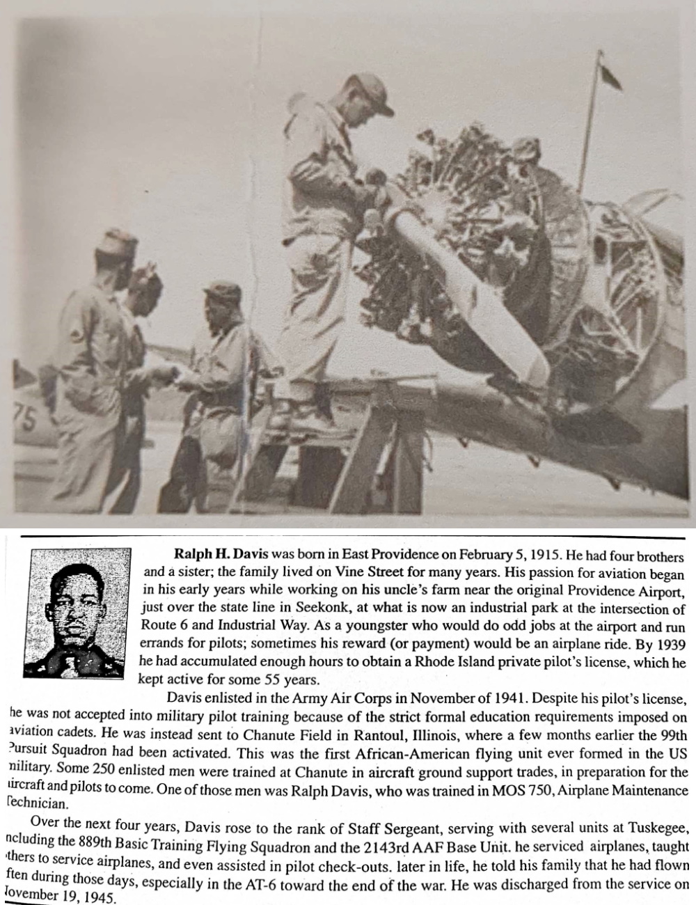 Rhode Island native Ralph H. Davis earned his pilot's license by 1939 and enlisted in the Army Air Corps in November 1941. He was trained as an airplane maintenance technician and served as an instructor with the 889th Flying Squadron and 2143 AAF Base Unit. After World War II, Staff Sergeant Davis and his family settled in his wife's hometown of Staunton, Virginia. The photograph of Davis inspecting a plane during World War II accompanies his biography for the Rhode Island Aviation Hall of Fame. The remaining photographs were published in the yearbook of the Tuskegee Army Flying School.
